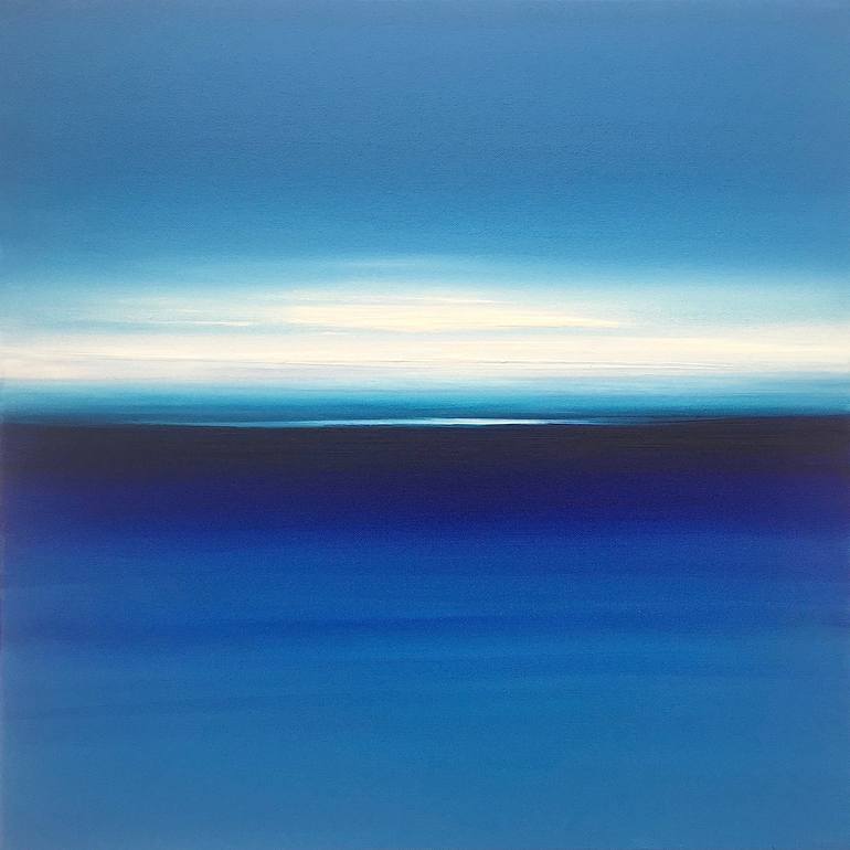 “Out on the Ocean, Sailing Away” is an ethereal abstract seascape oil painting 60cm x 60cm (24 x 24 inches) on 4cm (1.5 inch) deep canvas. Inspired by staring at the sea in Hastings with perfect weather when the sky and the sea were a beautiful blue and there was a sliver of light on the horizon. I...