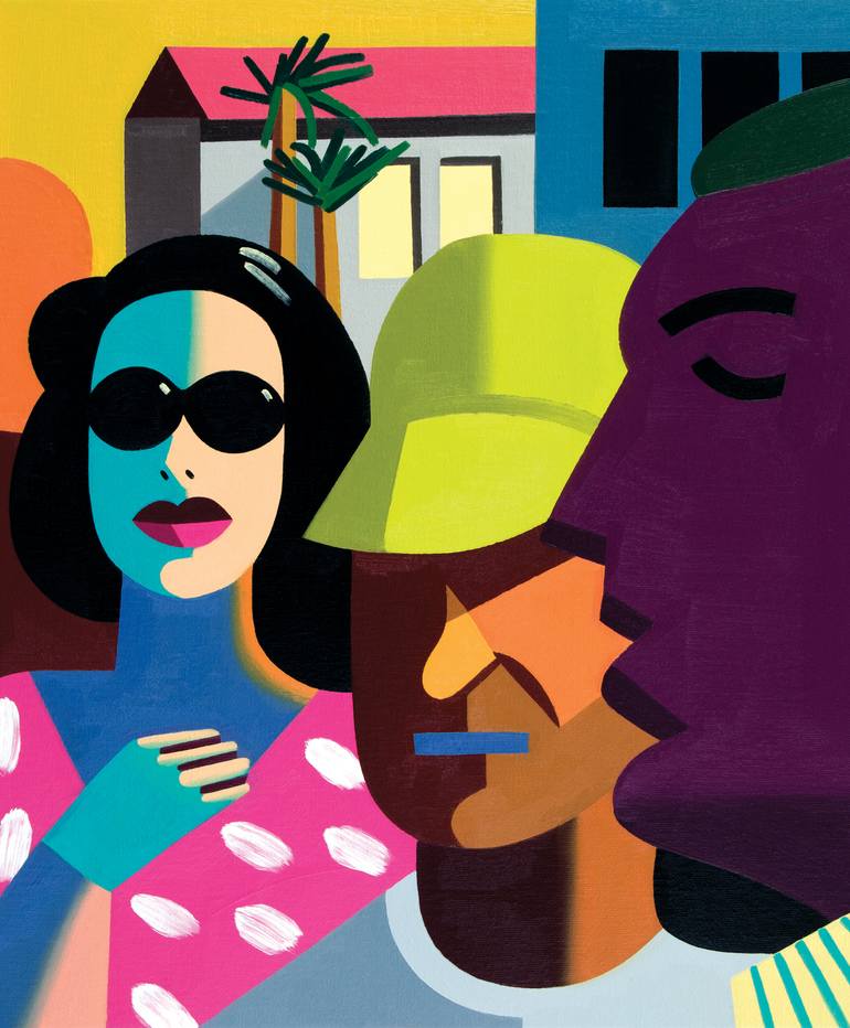 Another crowd painting. Three characters and a small cityscape with palm trees on the background.