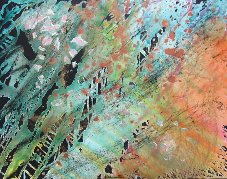 There is a strong directional pull in this painting, diagonally from right to left. There are other (not as strong) shapes going across the painting in the opposite direction. This represents going against the grain. Striking out on your own. There are elements of collage and bronze paint in this pi...