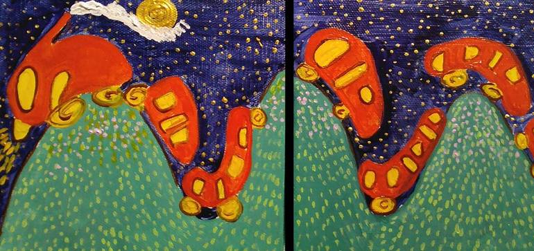 A lovely rendition of a magical train ride is portrayed. The train moves up and down the mountains in sync… The colors used by the artist are bright and beautiful… shades of dark blue representing the night sky, and in red, the train. The mountains are colored in green. A painting which brings a smi...