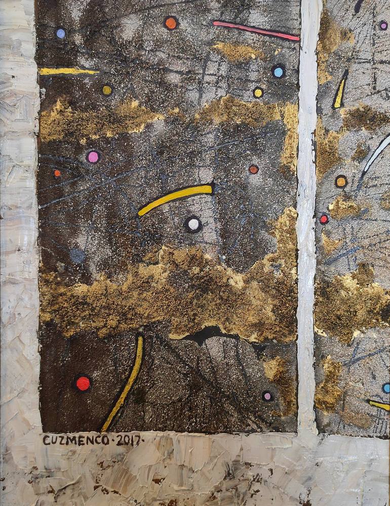 Victor Cuzmenco develops his art concept of Ontologic Painting inspired by fundamental questions of ontology. His ideas are embedded in simple geometrical shapes painted with sand, earth, clay, and shell limestone. Victor uses oil paints primarily due to their viscosity, fluidity and texture and applies primary colors in vivid and contrast spots. Non-objective and non-figurative compositions suggest zero plot or narrative free from material perception. A mesmerizing chaos trying to structure gives room for multi-scale perception of images whether these are cosmic formations or smallest physical particles. Ontologic paintings address the topic of spiritual excitement.