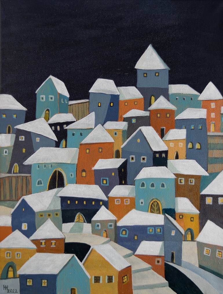 Original semi-abstract urban landscape with snowed white roofs, stairs and colorful houses during an overnight snowfall. It is a colorful geometric artwork made with oil paint on canvas. The painting is signed in front (+back) and accompanied with a certificate of authenticity signed by me. It is va...