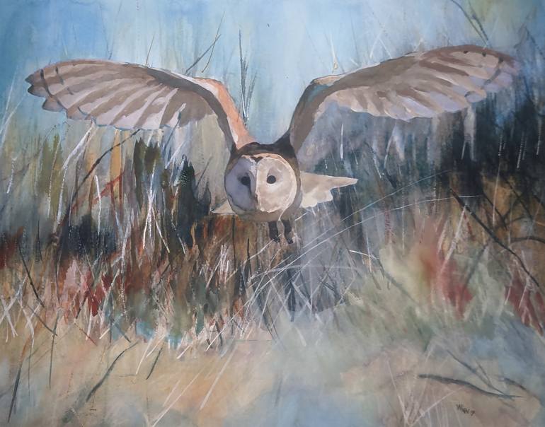 I love owls; they just make me smile. I paint a few a year. I wanted to paint this one in flight. I can see this one going after a small rabbit or mouse. I wish it was getting the ones that are destroying the lavender in our fields. Ah well... This is a 14X11 signed on the front and the back on 140l...