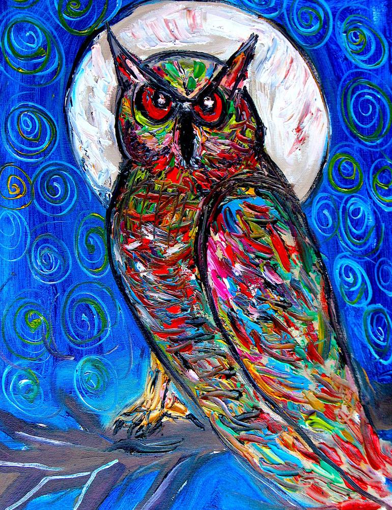 Painting owl in oil paint on canvas colorful abstract expressionism.