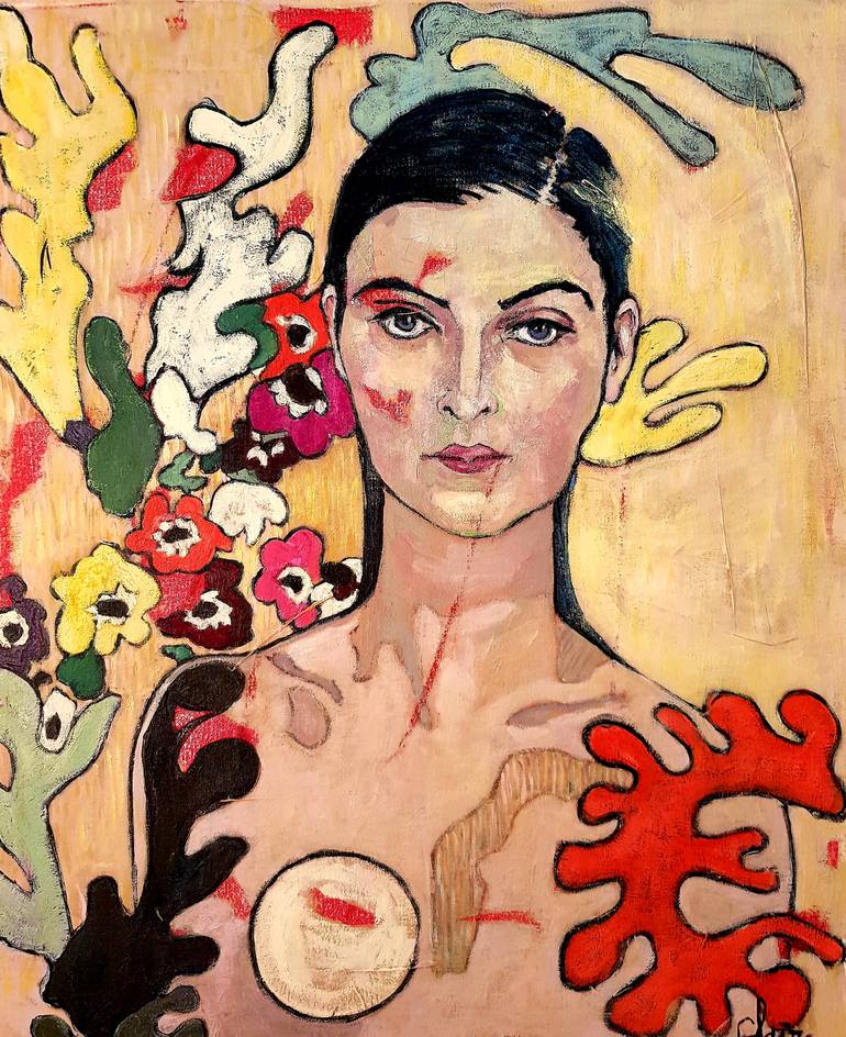 Poppy is the portrait of a dark haired woman lost in a dream. The painting has various patterns and illustrative imagery of poppy’s in the background. Her mood is defiant, her attitude is inquisitive yet the main scope is to exude mystery. She is enveloped by flowers, coral and colors that are very ...