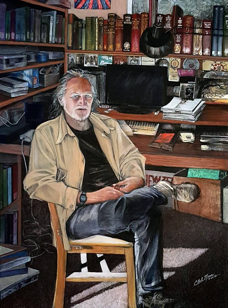 Well known Berkeley poet, Jim Powell, is a lifelong friend of the artist. Working from various photos the artist shot herself, the image is a composite view of the poet from 2009 until the present. He is picture in his longtime, Berkeley, California writing studio/home. Jim Powell is the author o...
