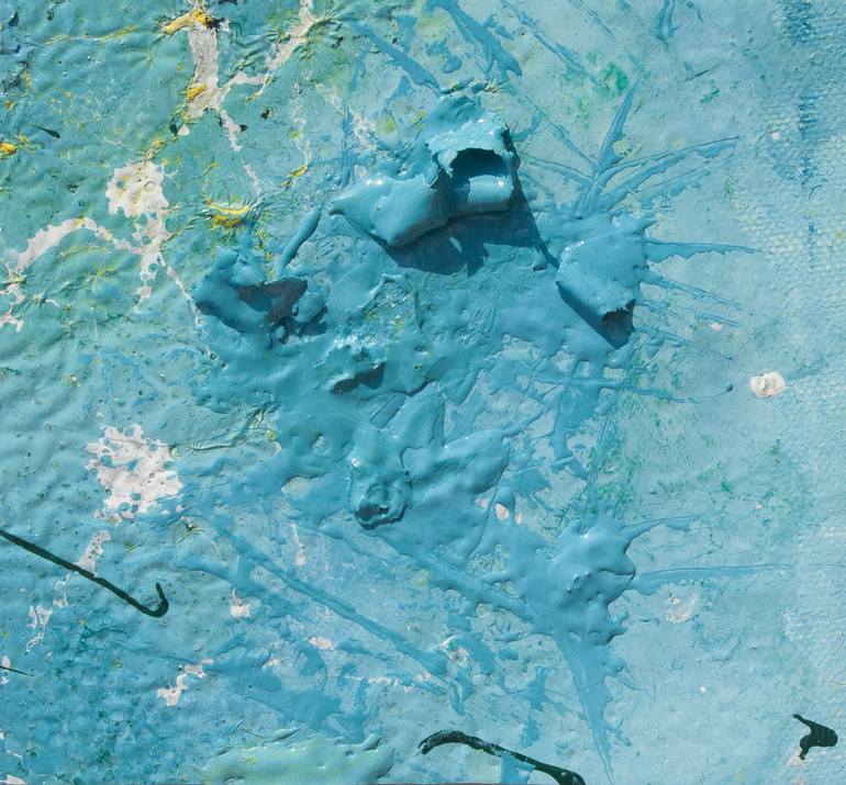 Light blue abstract image with dark green lines and spots, with white irregular shapes and spots and yellow streaks and spots on blue tones irregular background with pieces of clotted enamel. Artwork realized with enamel and tempera colors poured or dripped and smeared on canvas with a knife modifie...
