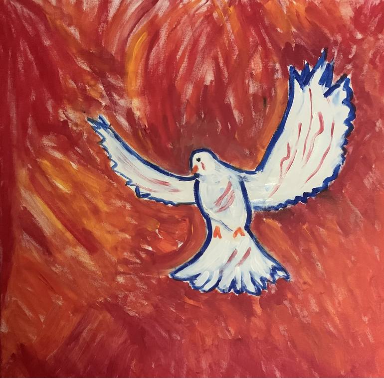 I am very troubled by what is going on between Israel and the Palestinian people. I believe we must pray for peace. I envisioned this in my mind’s eye and then painted it. Canvas stretched on wood. Sides painted red.