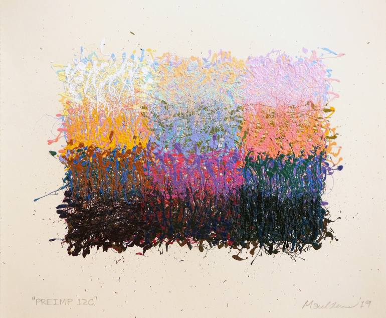 Before I start slinging paint on the IMP series, I have to warm the tool up and find out how the particular color is going to behave. Rather than waste the paint used to do that, I draw a grid onto a small piece of rag-based paper and use the colors to mix colors optically for the sake of pure expl...