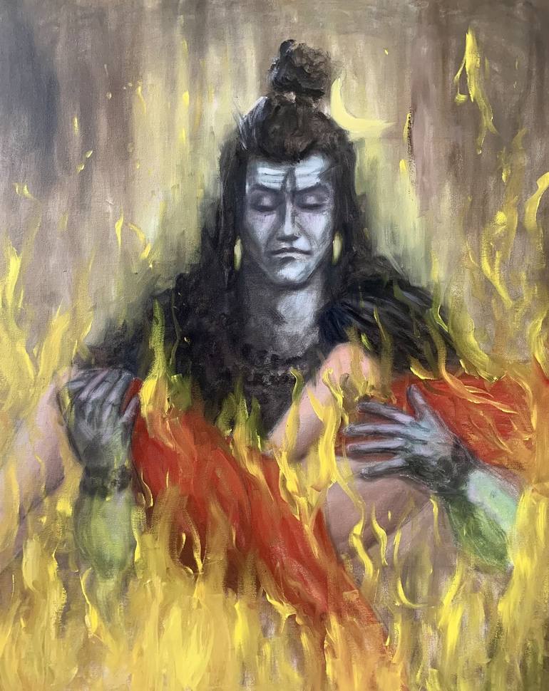 This Painting depicts the moment when Lord Shiva picks up Sati's burning body and is about to get into that furious state in which he began to perform a cosmic dance known as the Tandava. The full story can be read as below - The story of Shiv and Sati is a well-known tale in Hindu mythology. Accor...