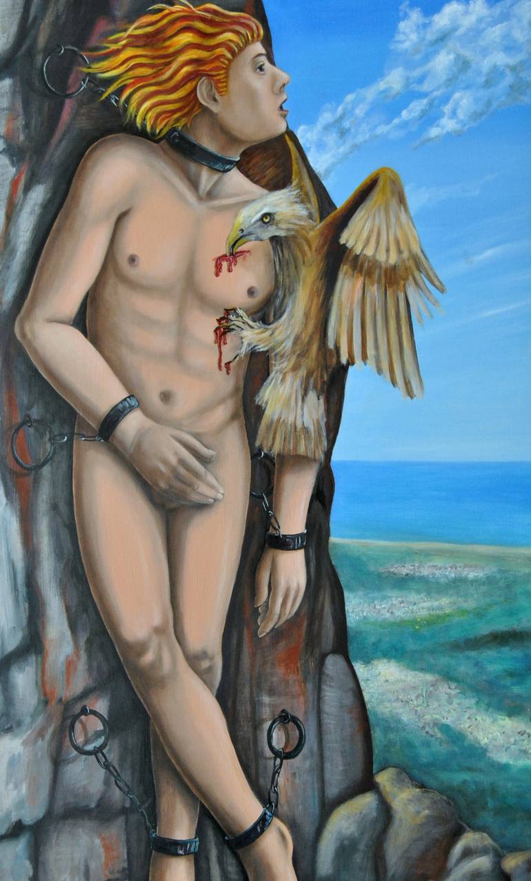 THE REVIEWING OF THE GREEK MYTH THAT TRIES TO STEAL THE PROMETHEUS FIRE (SYMBOL OF INTELLIGENCE AND GLOWING LIFE) THE GODS AND IS DISCOVERED AND PUNISHED FOR HIS HIS FACE AND'NOW RESIGNED TO THE ETERNAL PUNISHMENT, WHILE THE HAIR FLAMING REMEMBER THERE REASON. AND THE EAGLE DIGGING THE SUFFERING