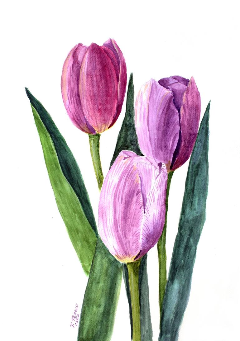 Title: "Purple tulips" Size: 16.5" by 11.7" (42 cm by 29.7 cm). Materials: watercolor paper 300g/m2, watercolor paints, artist brushes Artist: Tetiana Teresh Country: Czech Republic Creation date: 2022 Probably, there is nothing more beautiful than a woman's beauty and the beauty of a flower. I cur...