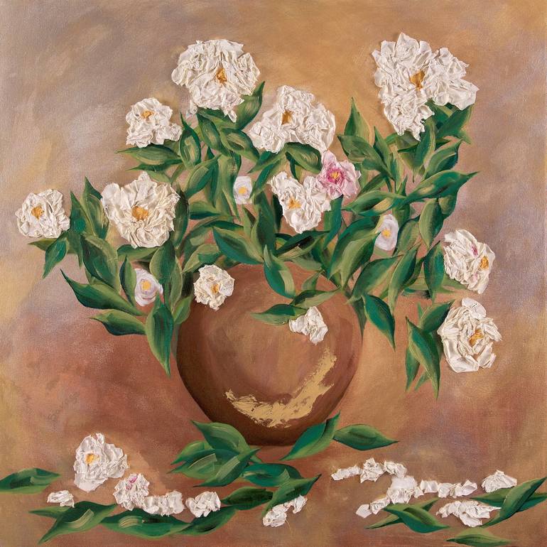 Paean to Peonies celebrates the lush beauty and fleeting grace of peonies. The painted surfaces engage with applied paper flowers, creating depth and texture that mirror the blooms’ layered complexity. This work invites viewers to savor moments of abundance and joy, while honoring their transience.