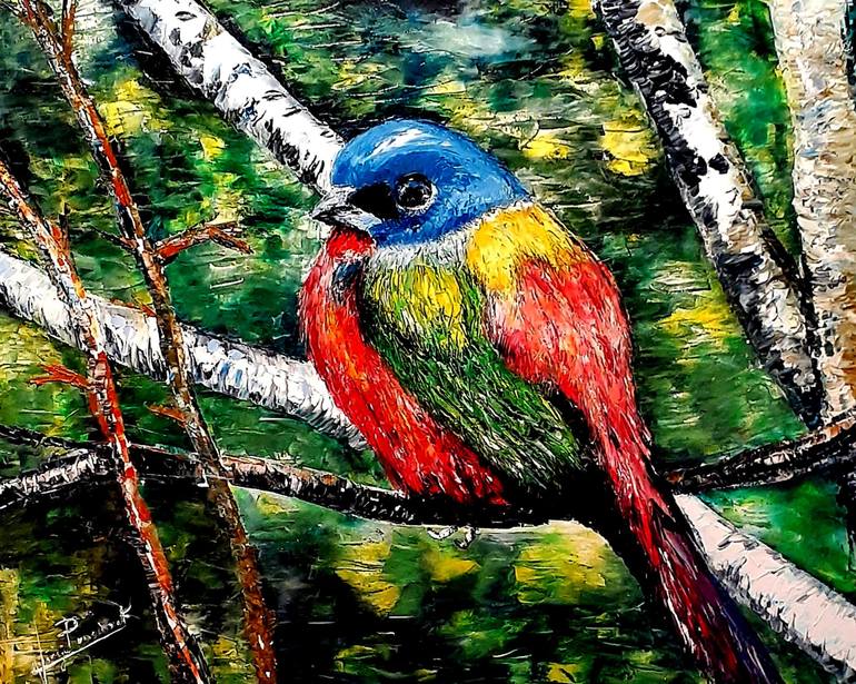 When I saw this painted bunting I stopped the project I was working on and jumped to paint him. The beautiful colors were so happily familiar: a true reminder of my overworked palette! Worked with palette knife, the impressionistic birch trees fading in the background enhance the bird texture and...