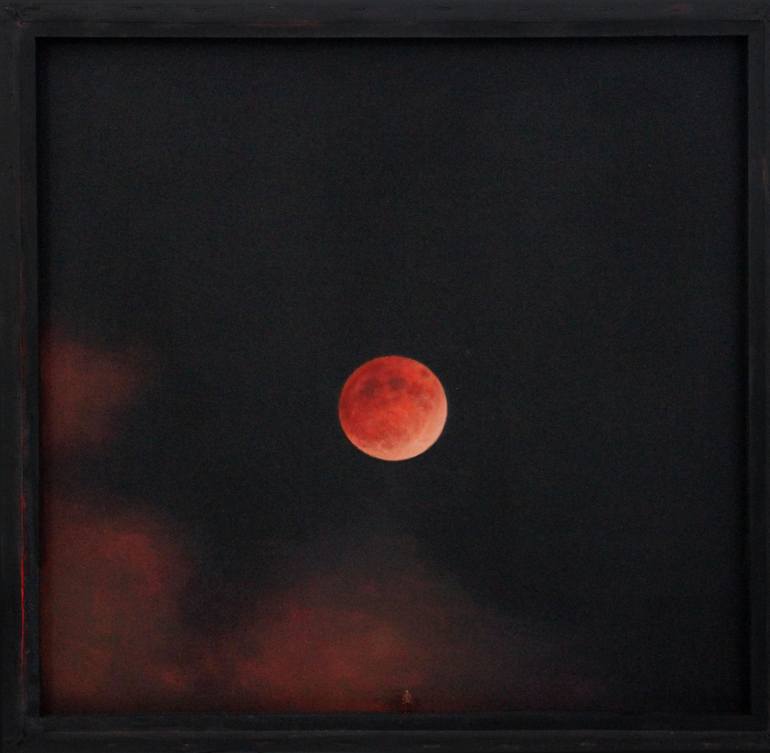 Acrylic on reverse canvas + miniature figurine. In recent years, the term Blood Moon has become popular when referring to total lunar eclipses. When the Earth eclipses a full Moon, the direct sunlight is blocked, but the sun's rays still light up the moon. This light, however, has travelled throug...