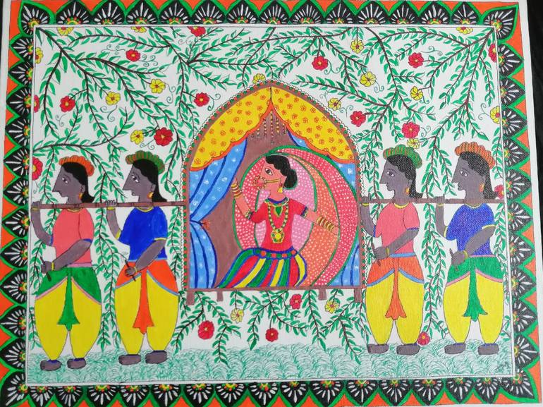 This madhupani painting is exclusively handmade by me using nib pens, brushes and waterproof acrylic colors. This painting is made on canvas board of 18 inches in length and 14 inches in width. This painting shows bride being carried on palki after wedding. This painting does not have any sort of fr...