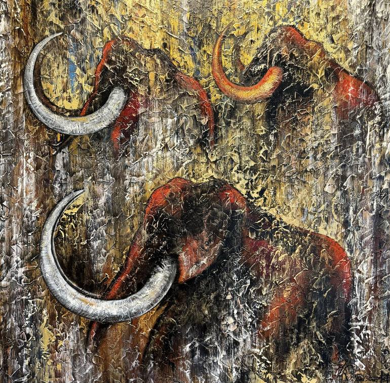 In the enchanting canvas, a glimpse of ancient times unfolds through a veil of early artistry. The painting transports us to an era where ancestral creativity was captured using rudimentary tools. Faded layers of the past reveal a family of mammoths, their essence emanating through the worn strokes ...