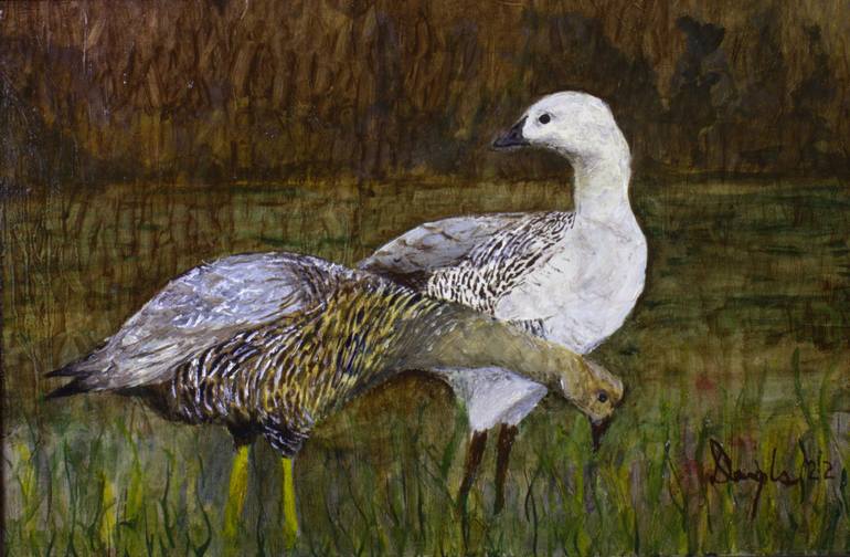 Part of the Waterfowl Series of oil paintings by Douglas Black, this painting shows a pair of Magellan Geese, male and female, a couple who trust one another to the fullest. She nibbles at the ground while he lifts his head and looks back at something beyond the left frame. Is it a threat? Or is it...