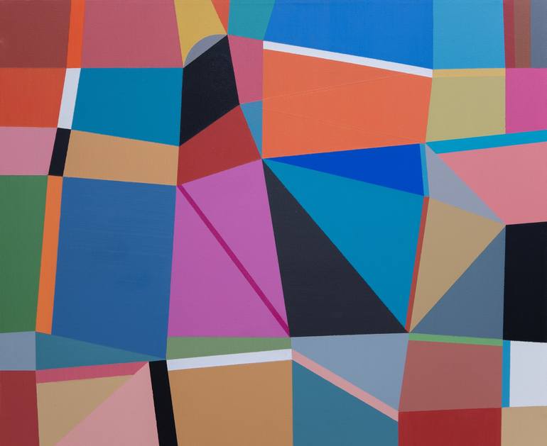This work is inspired by the colored planes of cultivated lands and although my intention when I do works of geometric abstraction is that they have no reference to reality, the result still seems to me like a landscape, for this reason, the title It is a luminous work with its bright colors that st...