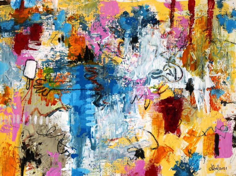 These 9x12 paintings are painted on a paper canvas. I paint these as artist block exercises but they have evolved into more complex works that have been selected for art shows and have sold well. These are good started works for the new collector that enjoys abstract art or expressionistic color sch...