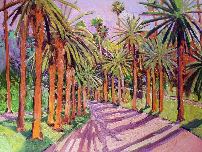 Festive colors fo early evening light with orange-pink hues outline the beauty of the driveway in Beverly Hills. Shapes of Palm Trees, orange, and olive green colors, and impasto texture reflect the vibe of this beautiful place. The artwork is on oil-primed canvas, stretched on wooden bars. It has a...
