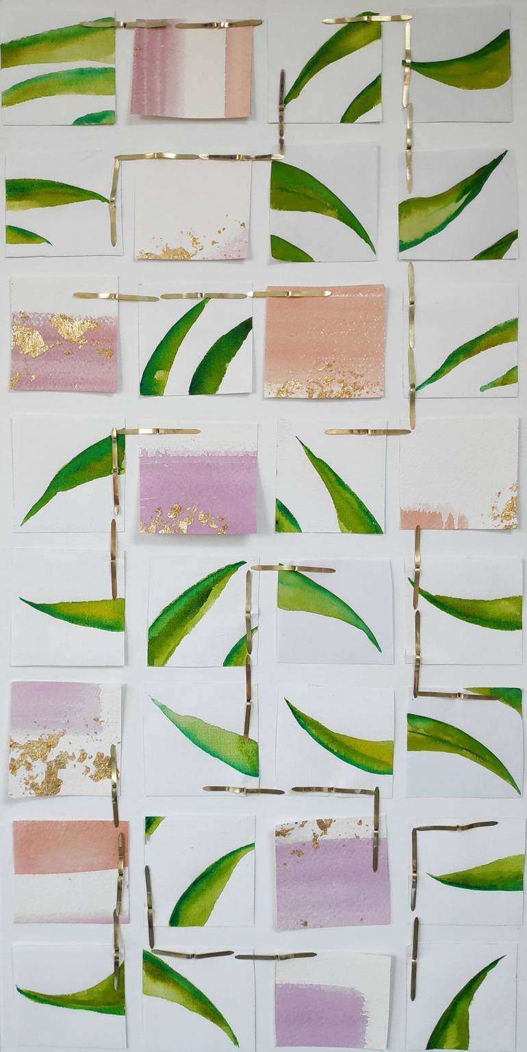 Palmier rose is extracted from the series “fertilitas”, semi-abstract but with vegetal patterns yet recognizable, here tips of palm leaves. Each pattern is made with watercolour on a small square of paper or canvas (7x7 cm each). Metallic splinters reflect the light thanks to the ties between square...