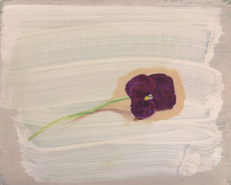 Pansy painted with fine detail in oil on abstract beige background with large brush strokes