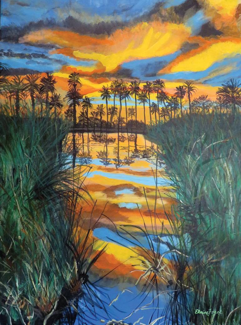 This artwork showcases a realistic but expressive depiction of a sunset landscape at Papago Park in Phoenix, Arizona. Dominated by warm sunset hues, the oranges, yellows, and golds are juxtaposed with cool blues in the sky and water. The reflection in the water captures the sunset vividly, almost as...