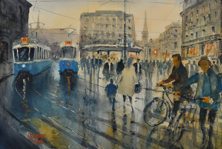 This is one of my favorite subjects: Financial Heart of Zurich, home of all big Swiss Banks - Paradeplatz with Frauenmünster Church, Hotel Savoy Baur en Ville and the iconic Zurich's blue trams. «Parade Platz 5:30pm» was painted in my studio on 300 g, 100% cotton, archival quality, rough Arches pap...