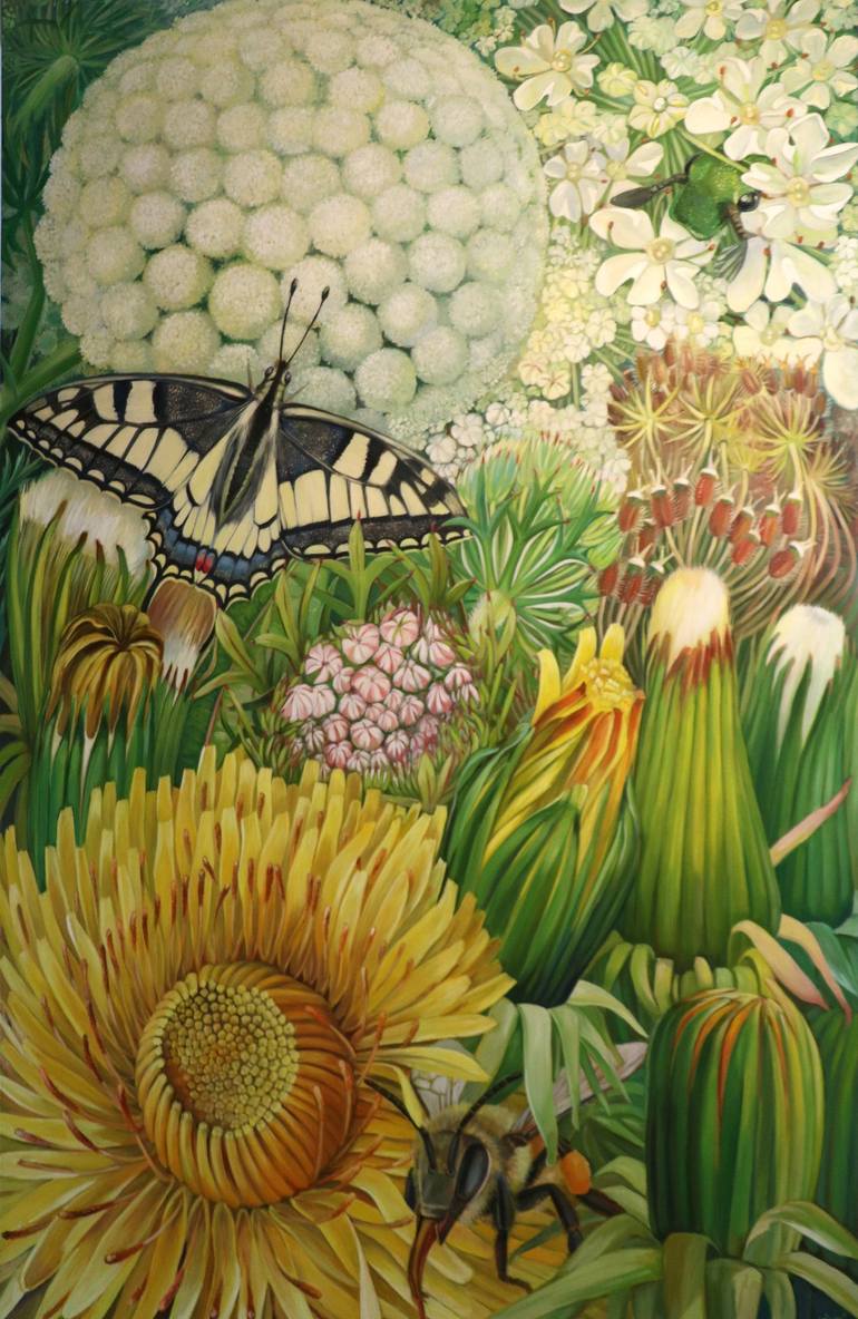 The "Paradise" series was created in response to the urgent issue of insect decline and its severe impact. Through my art, I aim to draw attention to our ecological crisis. Regional plants like thistle, poppy, dandelion, and wild carrot, which rely on pollinating insects, are struggling to reproduce...