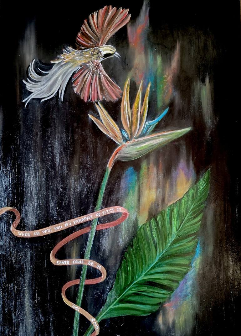 An evocative blend of light and shadow, this painting captures the delicate dance between a stylized bird and the Bird of paradise flower. The black background intensifies the vibrant colors, highlighting the fleeting beauty of life represented by the bird's motion and ribbon's poetic inscription. t...