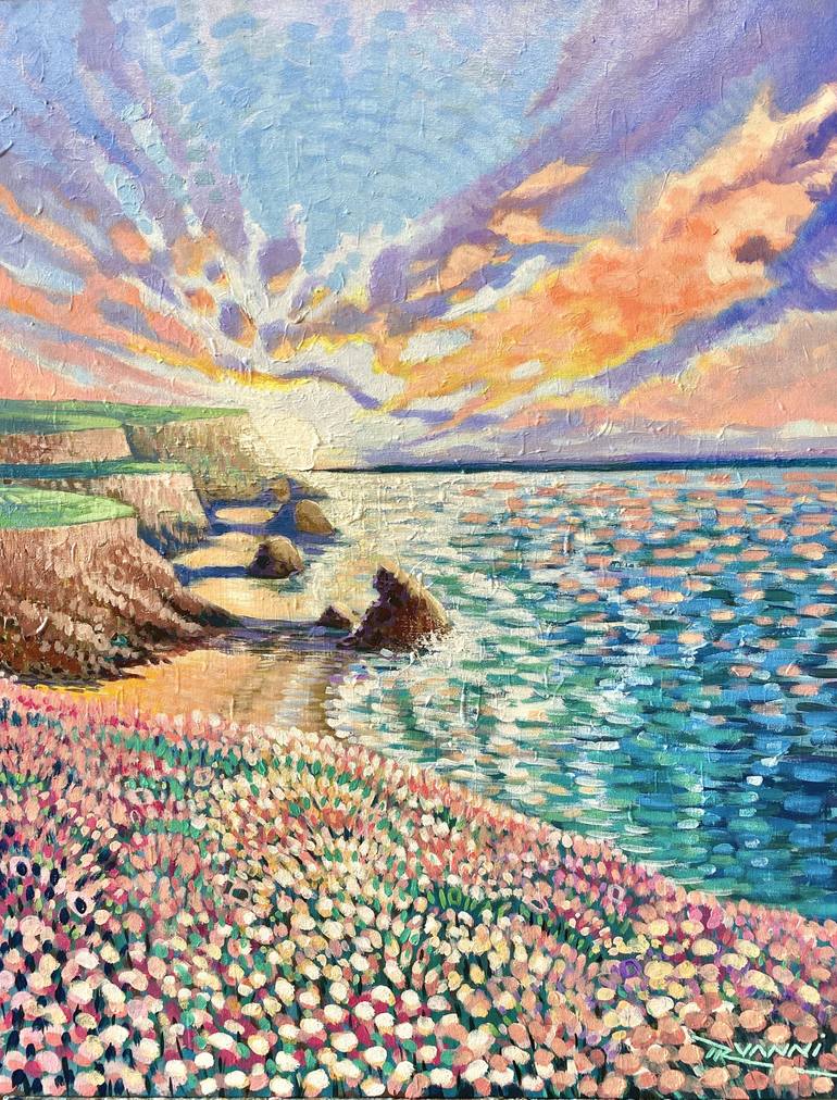 This acrylic painting was made with the intention to make the viewers feel relaxed and calm, feeling a unique sense of connection with them inner self, to feel the atmosphere, the sound of the waves breaking on the shore, the wet grass down on them feet. To contemplating the nature around us.