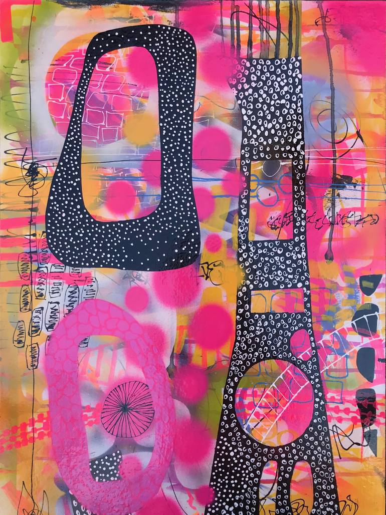 Pink Abstract Painting "Paris Mod": I was inspired to paint this colorful painting, and four others, by the art of several abstract artists from Denmark. Although each artist's art was quite different from the other artist's art, it was all in the expressionism style, lots of marks and brightly colo...