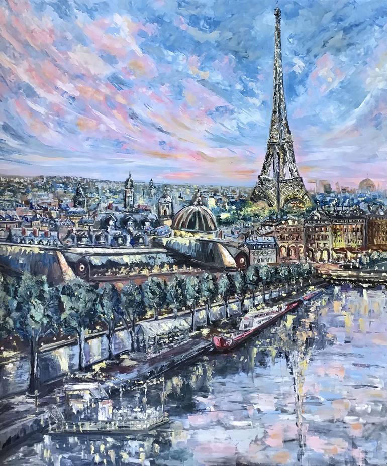 Invite the elegance and romance of Paris into your space with this original oil painting. Air of Paris captures the iconic Eiffel Tower illuminated at twilight, its reflection shimmering softly in the Seine River. This French cityscape is brought to life through expressive brushstrokes and a serene...
