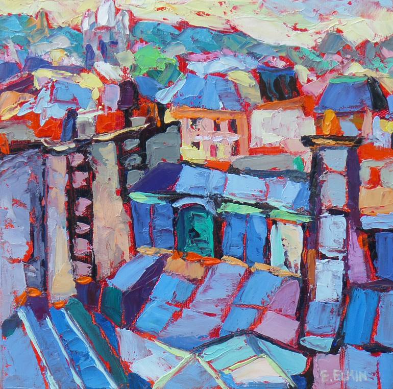 Paris Rooftops. This work has a small size 8"x 8" or 20 cm x 20 cm. Oil painting on premium gallery wrapped canvas, sides are white, ready to hang.