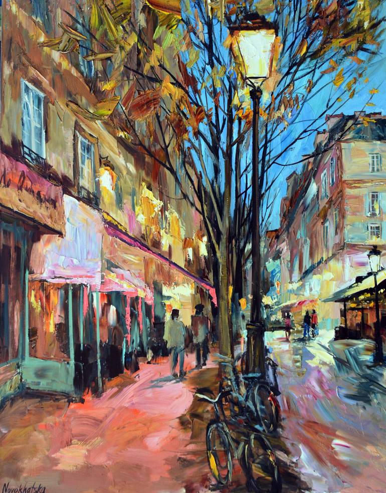 In this painting, representing the scene of Parisian life, I want to catch the ambiances, create a movement with the gesture of my brushes and palette knives. There is some impressionistic inspirations here, but I work in my personal style, creating a rich textures.