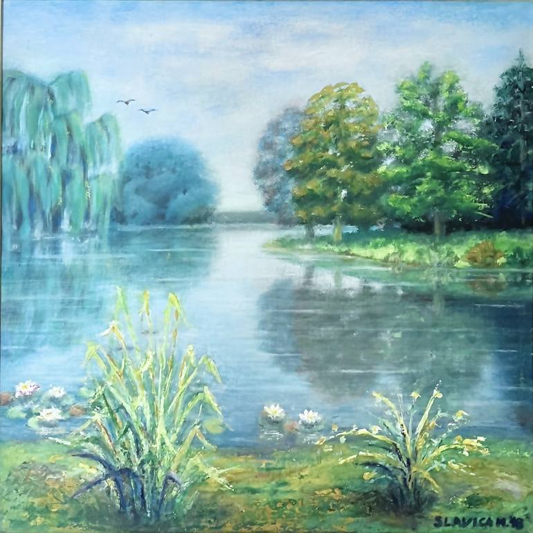 "Park in Breda, Netherlands," is an original oil painting on canvas. This beautiful artwork combines realism with impressionistic touches to depict a summer day lush park scene, complete with verdant trees and the tranquil reflection of water. The artist masterfully blends colors and textures using ...