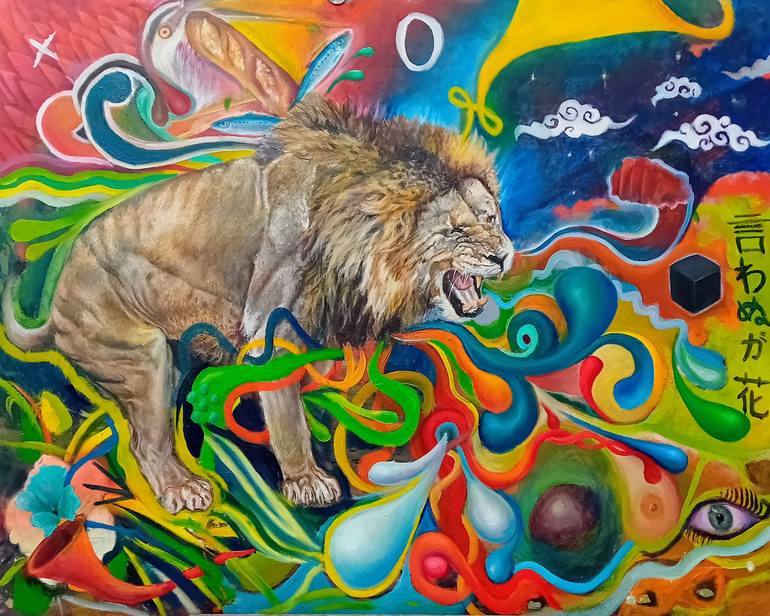 "Paroxysm," an oil painting of striking intensity, vividly portrays an enraged lion amidst an explosion of colors and movement. The canvas pulsates with vibrant oranges and fiery reds, swirling in chaotic harmony around the majestic beast. The lion's mane, a cascade of bold and deep colors , billows...