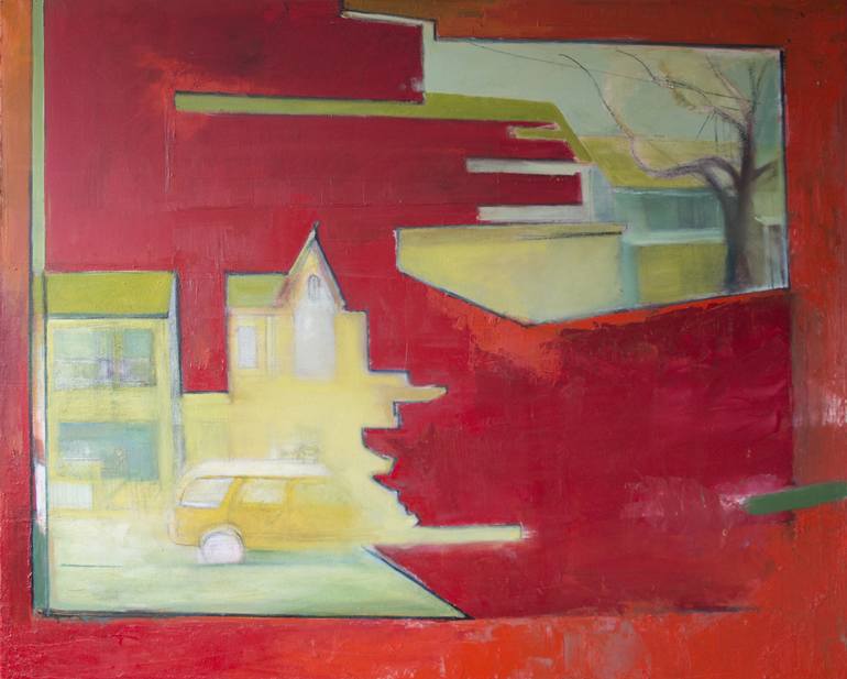 This painting is from my series Pivot which includes works that juxtapose subjects mined from photographs of Toronto.Here I look outside my studio through my metaphorical 'broken window', which is represented by the large abstracted colour-saturate shape/frame/division. This third element directs th...