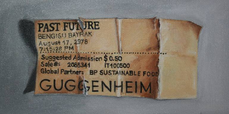 The ticket of my exhibition in the Guggenheim in 2978 about the aftermath of the great European nuclear explosion. The exhibition is an archive of samples of some of the fossils of small creatures and plants found in Europe and Middle East.