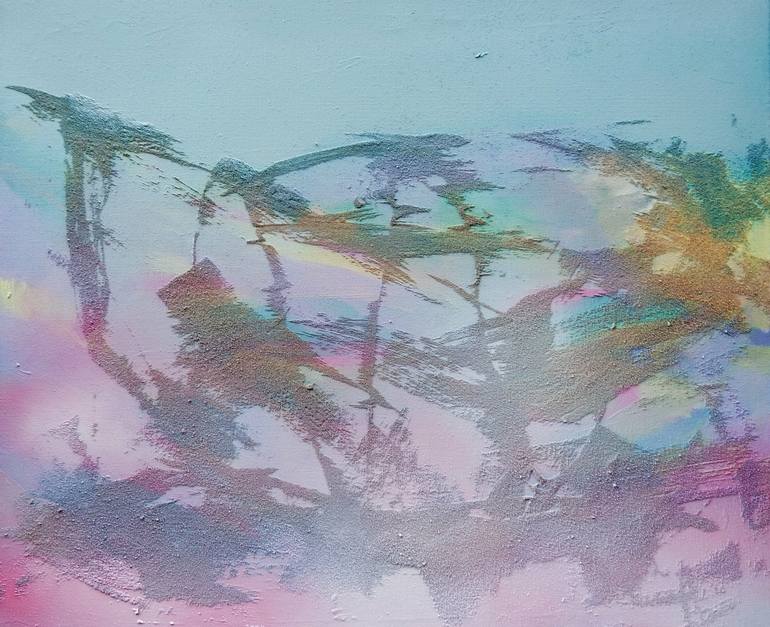 An abstract depiction of a hillside in pastel colours. Created using sand, spray paint and acrylics on canvas. 50 x 60 cms. Varnished. Signed on the back.