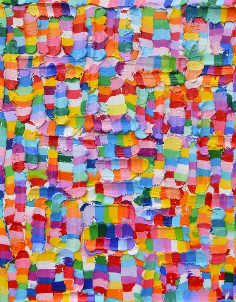 Heavily textured abstract rainbow painting created using only palette knives. Edges painted and wired; ready for hanging or framing.