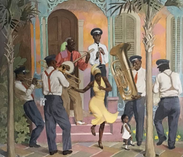 Impromptu music-making by members of a marching band and a banjoist out on his front porch. A passing woman or neighbor breaks into a dance as her tiny little girl "gets with it." (Two of my paintings will be hung in the new National Museum of African American History and Culture when it opens thi...