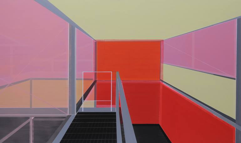 Cécile van Hanja, born in Corsica in 1964 and a graduate of the Gerrit Rietveld Academie in Amsterdam in 1993, is an artist based in Haarlem, Netherlands. Her artistic journey has been deeply influenced by her formative years spent in the South of France, later finding inspiration in the structured landscapes of the Netherlands. Van Hanja’s works epitomize the principles of ‘De Stijl’ and Modernism, notably influenced by Piet Mondrian’s straight lines and the movement’s pursuit of harmony and unity. Her fascination with the ideals of hope and prosperity stemming from these 20th-century movements is evident in her paintings, which often depict modern architectural compositions characterized by rhythmic patterns of verticals and horizontals. Emphasizing intangible aspects by creating open spaces, her paintings feature transparent walls and floors, leading to an interplay of reflections and vanishing points. The deliberate use of thin layers of acrylic and oil paint adds depth and luminosity to her works, allowing underlying colors to shine through and preventing the architectural compositions from becoming static. Cécile van Hanja’s art is renowned for its multi-colored labyrinth of spaces, creating an illusion of depth and complexity within a structured framework of lines and reflections. Her compositions invite viewers to explore the blend between rational and intuitive thinking, offering a unique perspective on modern architectural landscapes through her layered and transparent artistic approach. Her works are displayed in various private collections globally and represented by prominent galleries such as the Fremin Gallery in New York and Saatchi Art’s Samsung Architecture collection. Additionally, Cécile also accepts commissions. If you reside in a modern home and wish to commission a painting, you can submit a request through the Saatchi team, who will facilitate communication with the artist.