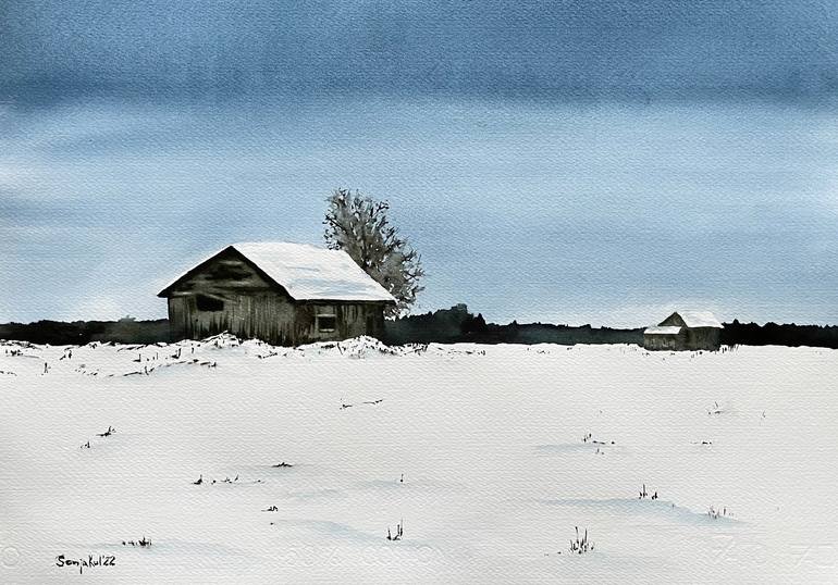 "Peace of Mind" is a captivating watercolor painting that transports you to a serene winter landscape. The artwork portrays a tranquil scene where wooden sheds stand amidst a pristine blanket of snow. In this quiet solitude, the horizon reveals a dark forest in the distance, while a clear blue sky o...
