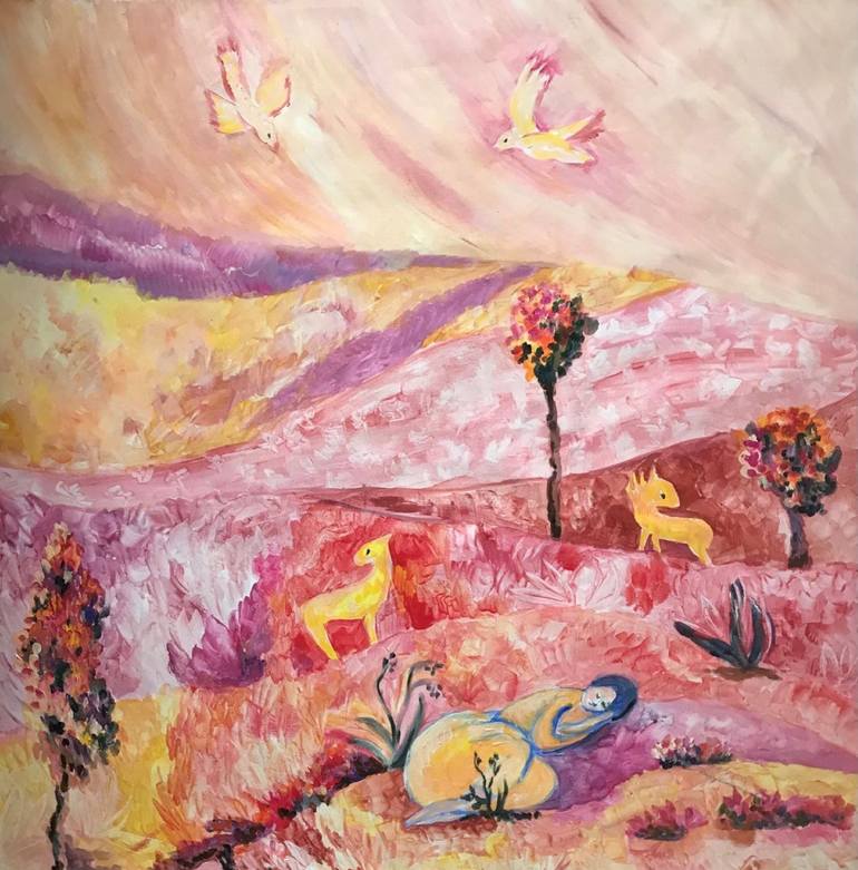 In her new painting from the "Silence" series, the artist masterfully conveys the depth of tranquility and inner peace. The vast landscape with the sleeping figure of a woman in the foreground creates a sense of safety and rest, which is particularly important in times of great turmoil and instabili...