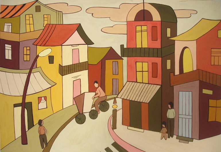 "The painting depicts the scene of Hoi An ancient town in the late afternoon, when the last sunlight of the day dyes the ancient roofs golden. The houses with traditional architecture, the red brick roads , the lanterns hanging in the space create a mesmerizing scene. The warm yellow light reflects ...