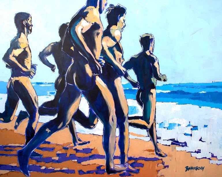 I find beauty in the simplicity of human interactions. This original acrylic painting showcases the power of friendship and love through the movement of five male figures running nude on the beach. Their well-defined bodies and great posture are emphasized by the dark colors in contrast with the bri...