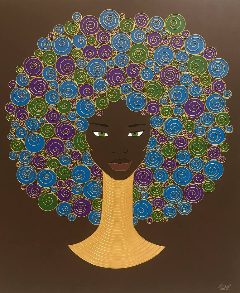Women inspire me a lot. They represent to me strength and vulnerability, and I try to convey this feeling through my painting. I tried to reveal that this majestic woman has a strong spirit. Her head is standing on a necklace covered in gold and look straight ahead. I wanted to show contrasts with...