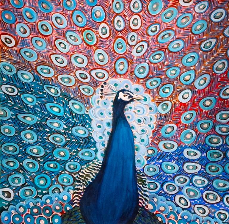 This artwork vividly portrays a majestic peacock in full display, its plumage fanning out in a breathtaking array of colors and intricate patterns. The composition is dominated by the bird's iridescent tail, which transitions from deep, luscious blues to vibrant reds and oranges, creating a mesmeriz...